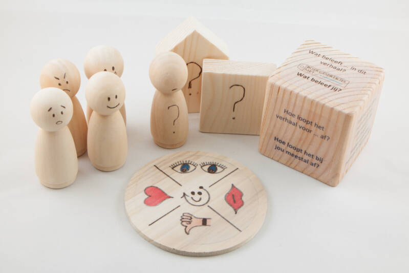 Wist je dat er ook een houten materialenset is? Bedoeld om Boekgesprekjes met... te visualiseren en te concretiseren voor kinderen? Deze set zet je in bij het prentenboek om het (coach)gesprek te starten en het welbevinden en talentontwikkeling spelenderwijs te vergroten. Emotieregulatie en bewustwording staan hierbij centraal.
